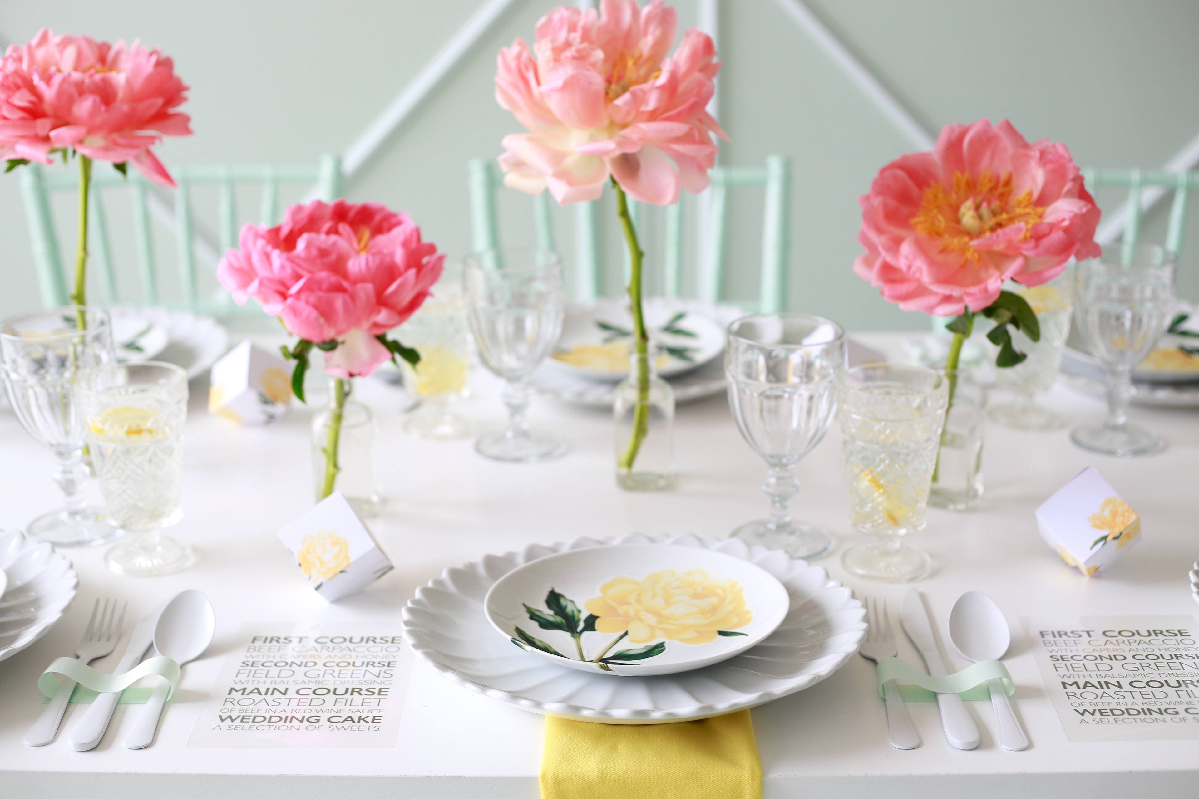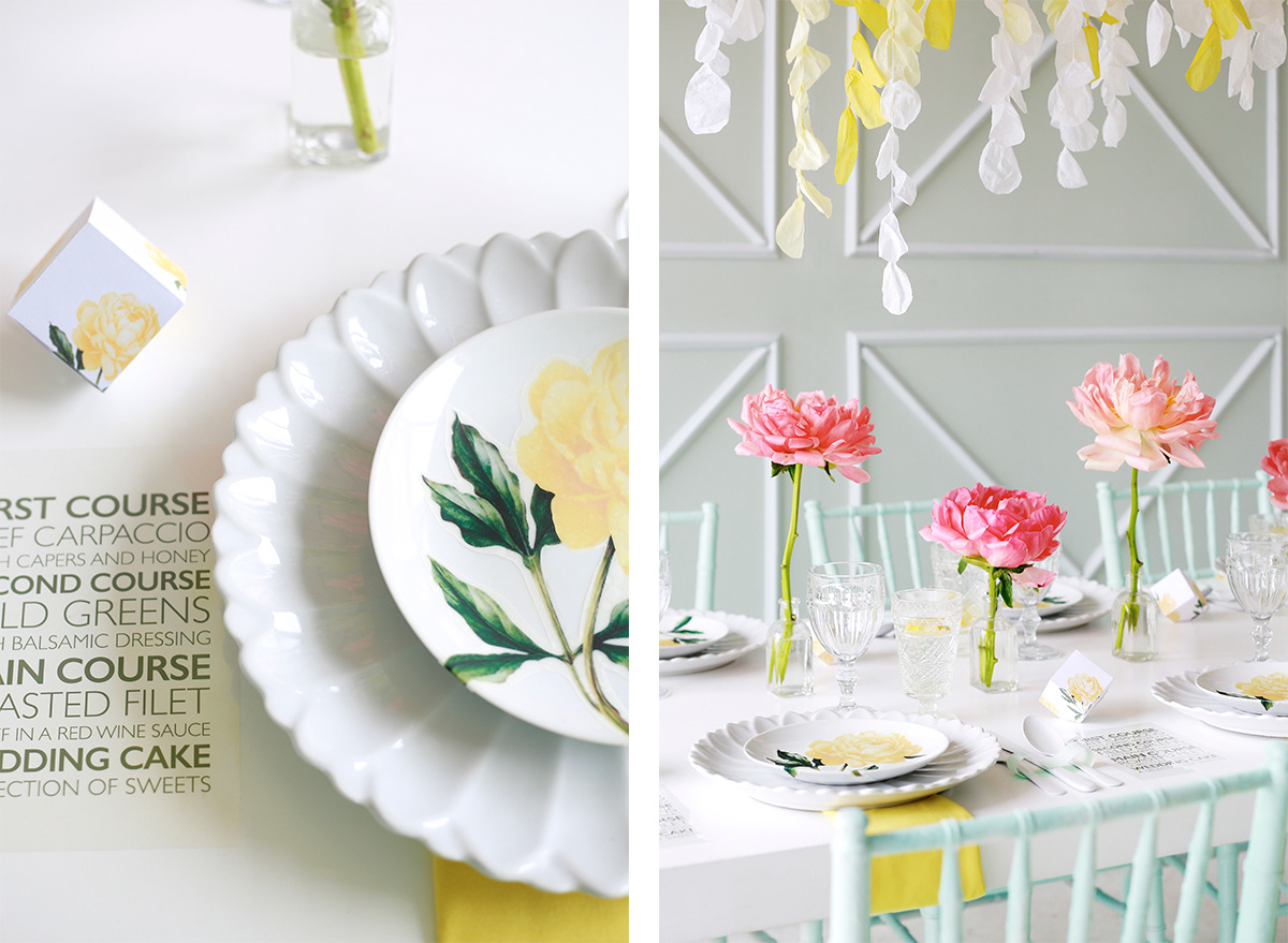 Styling: Azar Jazestani Hanging Paper Flowers: Maggie Terrone Stationery, Favor Boxes, Plate Decals: Jen Miller
